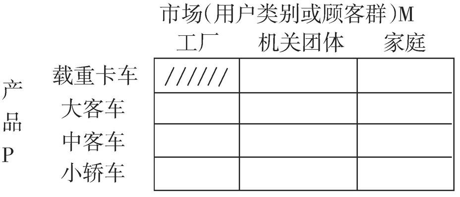 图中包括三种不同的用户类别、四种不同产品共有12个细分市场,企业根据自身能力,确定工厂用载重卡车是最有利的市场。