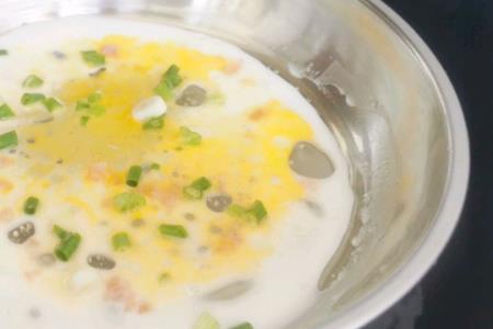 步骤7、勺入粉浆,(薄薄一层即可,多余的粉浆要倒出来)加入肉末,鸡蛋液,葱花,盖上锅盖大火蒸3分钟。这一步看个人情况,肠粉中加玉米,生菜,腊肠,香菇丁,牛肉,猪肝都可以的,口味众多。