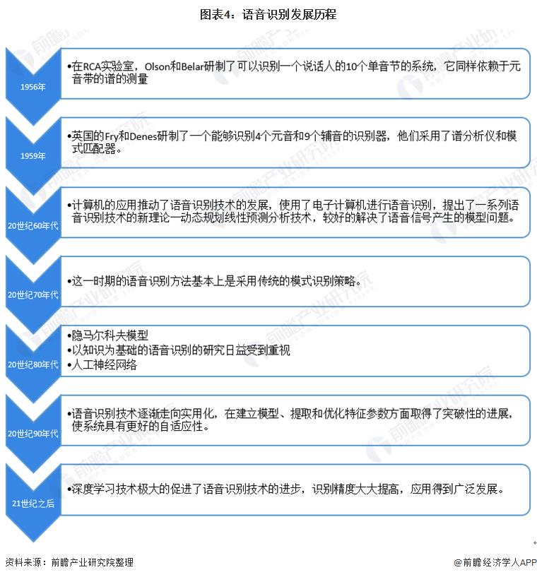 语音识别的研究工作可以追溯到20世纪50年代。在1952年,AT&T贝尔研究所的Davis,Bidlph和Balashek研究成功了世界上第一个语音识别系统Audry系统,可以识别10个英文数字发音。这个系统识别的是一个人说出的孤立数字,并且很大程度上依赖于每个数字中的元音的共振峰的测量。1956年,在RCA实验室,Olson和Belar研制了可以识别一个说话人的10个单音节的系统,它同样依赖于元音带的谱的测量。到21世纪之后,深度学习技术极大的促进了语音识别技术的进步,识别精度大大提高,应用得到广泛发展。