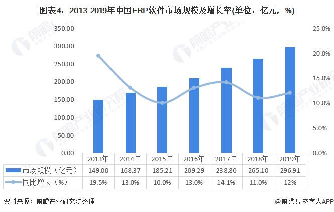 2013-2019年,我国ERP软件市场规模一直处在增长的趋势。在2017年出现了一波较大幅度的增长后,后面两年是市场规模的增速出现了放缓。2019年,中国ERP市场规模将达到约297亿元,同比增长12%。