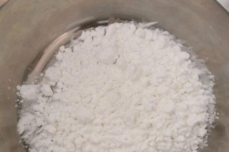 步骤4、盘中加入粘米粉100克,清水200克,少许盐,少许油,然后30克玉米淀粉调成粉浆加入,搅拌均匀。