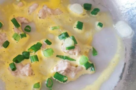 步骤7、勺入粉浆,(薄薄一层即可,多余的粉浆要倒出来)加入肉末,鸡蛋液,葱花,盖上锅盖大火蒸3分钟。这一步看个人情况,肠粉中加玉米,生菜,腊肠,香菇丁,牛肉,猪肝都可以的,口味众多。