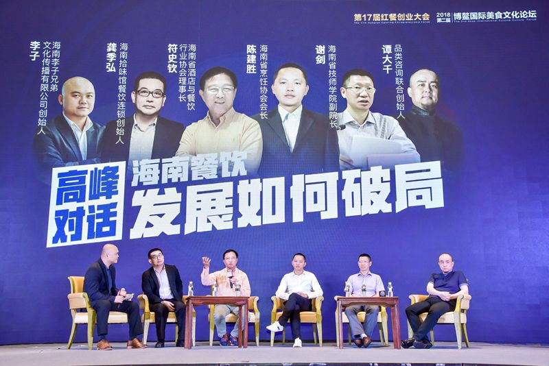在嘉宾主持海南李子兄弟文化传播有限公司创始人李子主持下,海南省酒店与餐饮行业协会理事长符史钦、海南省烹饪协会会长陈建胜、品类咨询联合创始人谭大千、海南省技师学院副院长谢剑、海南拾味馆餐饮连锁创始人龚季弘就“海南餐饮发展如何破局?”这个话题展开了讨论。