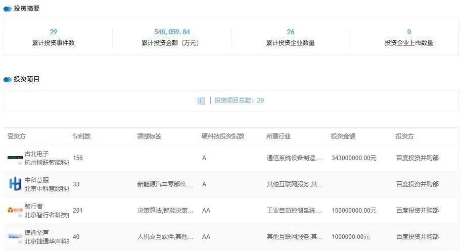 百度投资的项目还真不少,29个,累积投资金额超过54亿元,其中除智行者外,排在比较靠前的古北电子,中科慧眼、捷通华声硬科技投资指数都很高,要不是怕偏离主题,我可能忍不住跑去看另外三家企业干什么的。