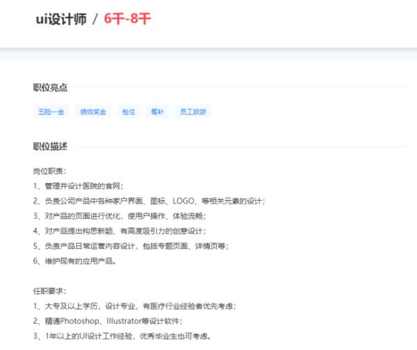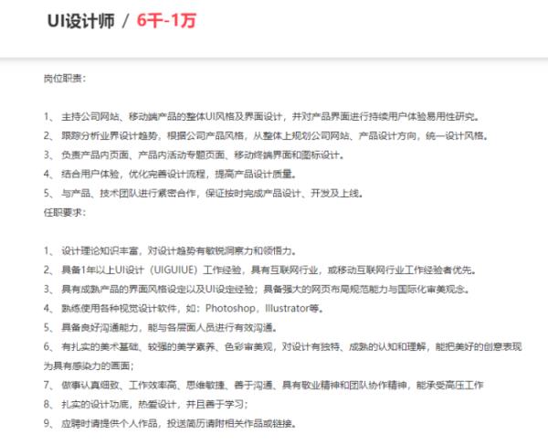 在招聘网站中搜索对应的职位,对于美工,要求精通Photoshop、AI、DW、C4D等设计软件,对图片渲染和视觉效果有较好认识。但是对于UI设计师,除了要求对工具的掌握,对审美的需求,更多的是对软件界面、网页、移动端App等界面设计有深入见解,并且具备一定的交互设计基础,有些企业甚至要求掌握前端相关知识。