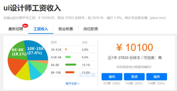 那你可能会问,美工的薪资水平较低,那UI设计的薪资水平就很高了吗?我们从两份工作的平均工资去简单了解对比一下,美工和UI设计哪个更有“钱”途。