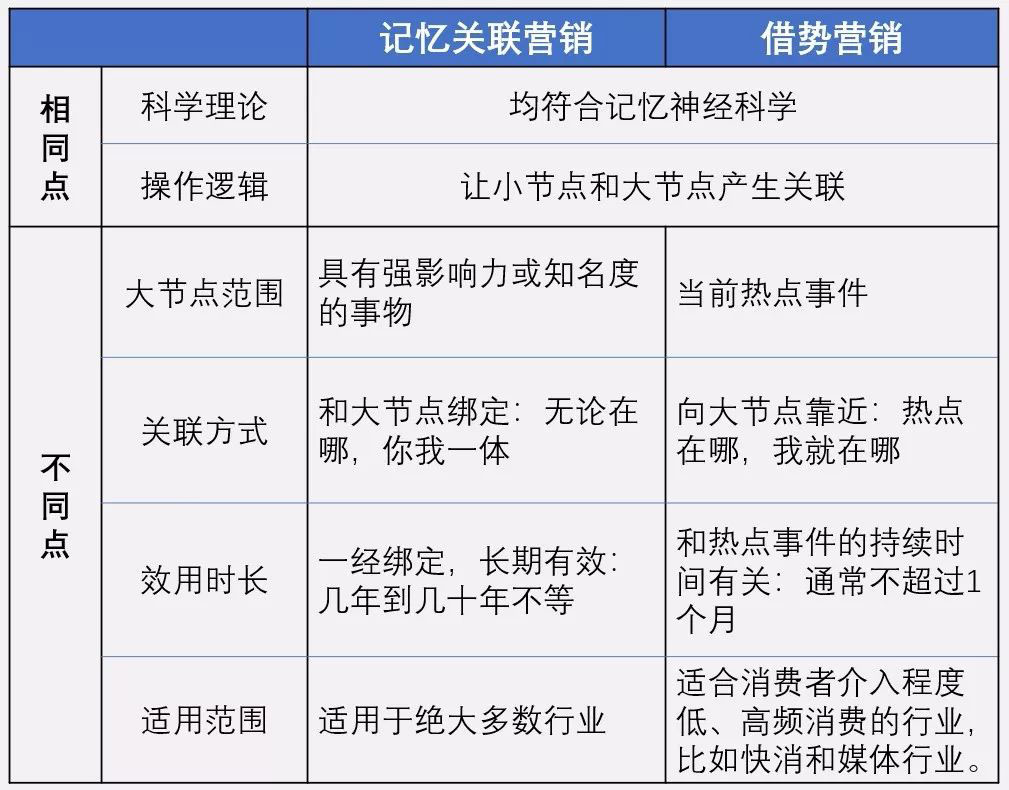 如果说利用热点事件吸引消费者的注意力属于借势营销,那这种将自己品牌和强影响力节点进行绑定,从而形成记忆关联的方式,就叫作“记忆关联营销”。